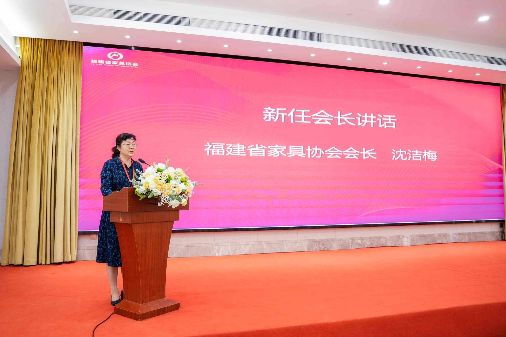 福建省家具协会第八届理事会会长沈洁梅发表就职讲话。她首先对全体会员的信任与支持表示感谢,并深情回顾了行业在过去五年间携手并进、共克时艰、转型升级的峥嵘岁月。她指出,面对世界的深刻变革,福建家具人将摒弃焦虑与观望,坚定“向高而攀、向新而行”。她表示,“任重道远者,不择地而息”,新一届理事会将不辱使命不遗余力,坚持服务为本,坚持创新驱动,以更加开放的姿态,更加务实的作风,更加创新的精神,团结带领广大会员企业,以梦为马,谋新致远,共同书写福建家具业壮丽的“新山海经”!