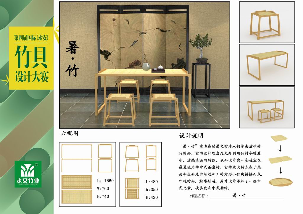 8月17日至19日,第四届国际(永安)竹具设计大赛作品评审会在福建省永安市成功举行。经过国内外评审专家评审和票决,评选出实物类、应用工程类及非实物类金、银、铜奖作品共23件,其中,浙江农林大学陆栋的作品《暑竹》获得实物类金奖,沣茂工作室王树茂的作品《清竹餐厅》获得竹应用工程类金奖,顺德职业技术学院赖浩塱的作品《舟》获得非实物类金奖。