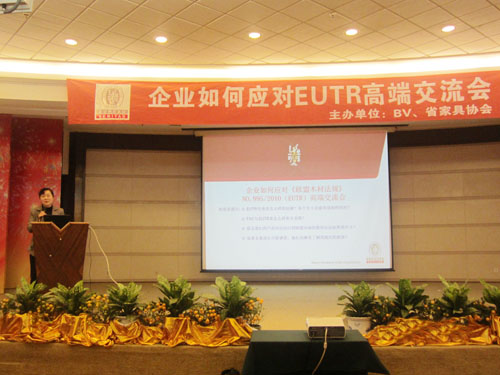 本刊讯 欧盟法规再起风浪,华夏商士共研计策。为了让企业详细了解《欧盟木材法规》,加强防范意识,降低出口影响,规避贸易壁垒,福建省家具协会联合必维国际检验集团于2013年2月27日在福州美伦华美达大饭店召开“企业如何应对EUTR高端交流会”,福建省家具协会副理事长兼秘书长沈洁梅出席会议并为大会致辞。