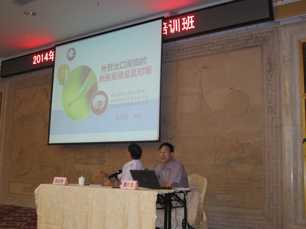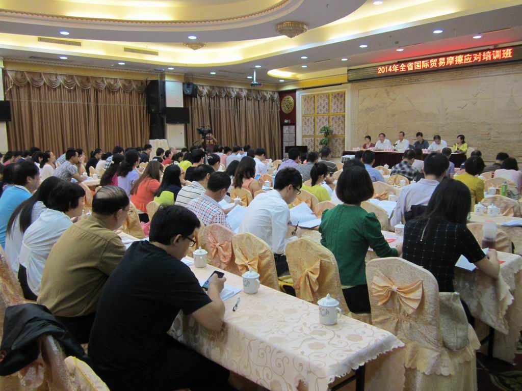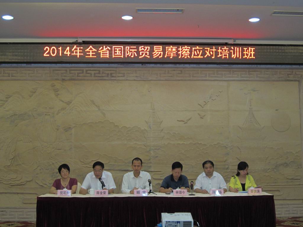 本刊讯 “欧风美雨”起波折,心齐力协攻难关。为了提升我省各地商务主管部门、行业商协会和企业应对贸易摩擦及运用贸易救济措施维护自身利益的能力,维护我省外贸出口市场稳定,福建省商务厅于2014年10月15日在泉州举办“2014年全省国际贸易摩擦应对培训班”。商务部贸易救济调查局顾宇处长、省商务厅贸易与产业安全处陈扬处长、福建省对外经济贸易教育协会林颂今会长等领导,来自国家质检总局标准与技术法规研究中心、省标准化研究院、北京金诚同达律师事务所、泉州电子信息学院的专家、教授、老师,各设区市、平潭综合实验区和部分重点涉案县级商务主管部门代表,以及省家具协会、省纺织行业协会、省机械工业联合会等16家省公平贸易行业组织工作点商协会代表共110多人出席了大会。会议由省对外经济贸易教育协会林颂今会长、陈金荣秘书长主持。