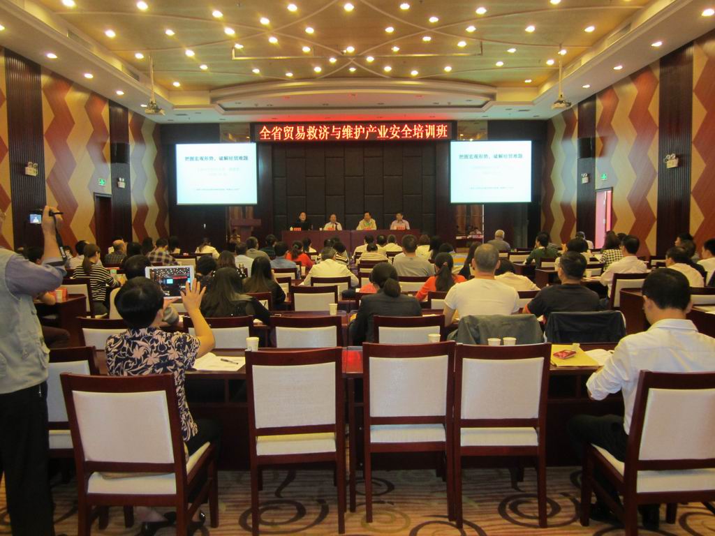 本刊讯 新常态,新发展,同心协力齐对贸易摩擦;优结构,优动力,奋发进取共护产业安全。为了不断提升我省各地商务主管部门和行业商协会组织指导应对贸易摩擦及运用贸易救济措施保护市场利益的能力,维护我省产业安全和外贸出口市场稳定,福建省商务厅于2015年11月12日在厦门举办全省贸易救济与维护产业安全培训班。福建省对外经济贸易教育协会会长林颂今,上海对外以贸大学国际经贸学院院长黄建忠,福建省商务厅贸易产业处副处长彭昌华、副调研员倪可升,省标准化研究院负责人,北京国浩律师事务所律师,各设区市商务局,平潭综合实验区经发局,省企业信息中心,省WTO/TBT通报咨询中心以及省家具协会、省陶瓷行业协会等省公平贸易行业组织工作点商协会代表共110多人参加了大会。会议由省对外经济贸易教育协会林颂今会长、陈金荣秘书长主持。